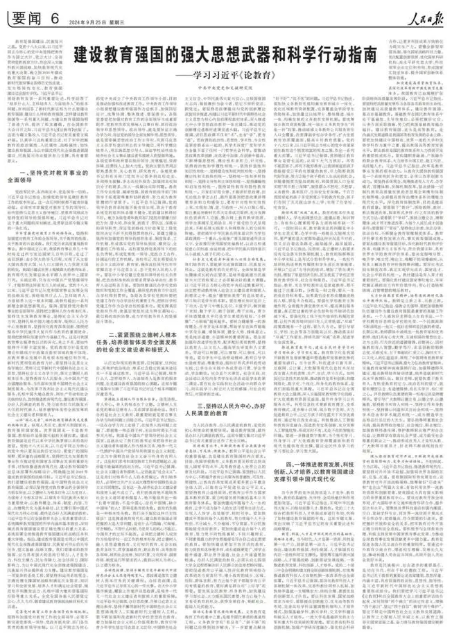 教育是强国建设、民族复兴之基。党的十八大以来,以习近平同志为核心的党中央坚持把教育作为国之大计、党之大计,全面贯彻党的教育方针,作出深入实施科教兴国战略、加快教育现代化的重大决策,确立到2035年建成教育强国的奋斗目标,推动新时代教育事业取得历史性成就、发生格局性变化,教育强国建设迈出坚实步伐。习近平总书记围绕教育发表一系列重要论述,科学回答了“培养什么人、怎样培养人、为谁培养人”的根本问题,深刻回答了新时代新征程为什么要建设教育强国、建设什么样的教育强国、怎样建设教育强国等一系列重大问题,为建设教育强国指明了前进方向、提供了根本遵循。在全国教育大会召开之际,习近平总书记《论教育》出版了。这部专题文集收入习近平总书记有关重要文稿47篇。认真学习这些重要论述,对于牢牢把握教育的政治属性、人民属性、战略属性,加快建设教育强国,为以中国式现代化全面推进强国建设、民族复兴伟业提供有力支撑,具有重要意义。