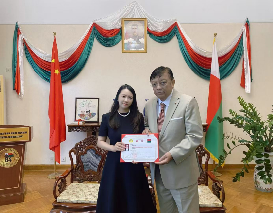 会谈结束后,让·路易·罗班松大使郑重向薛莹会长颁发马达加斯加共和国驻华大使馆特邀文化教育顾问证书,标志着两国文教合作翻开崭新一页。