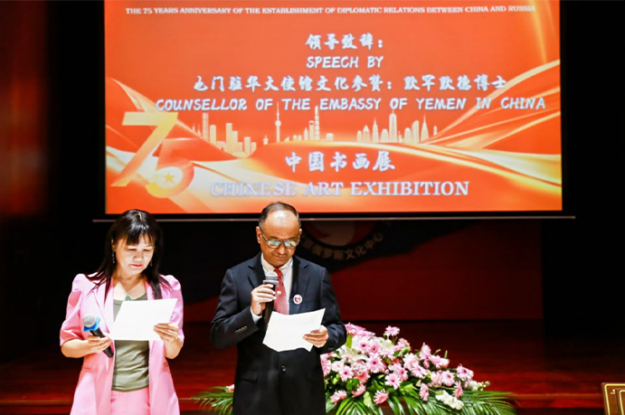 活动伊始,也门驻华大使文化参赞默罕默德博士作为主持人发言,介绍了此次活动的意义。他表示,中俄两国作为世界大国,彼此间的文化交流不仅拉近了两国人民的距离,更为全球多极化发展注入了新动力。俄罗斯文化中心主任吴丹娜随后致辞,热烈欢迎各位嘉宾的到来,并表示,希望通过此次书画展,将中俄文化交流进一步推向深入。中国宣传部原办公厅主任薛启亮先生也在现场聆听,并表达了对两国文化友好交流的支持与祝福。