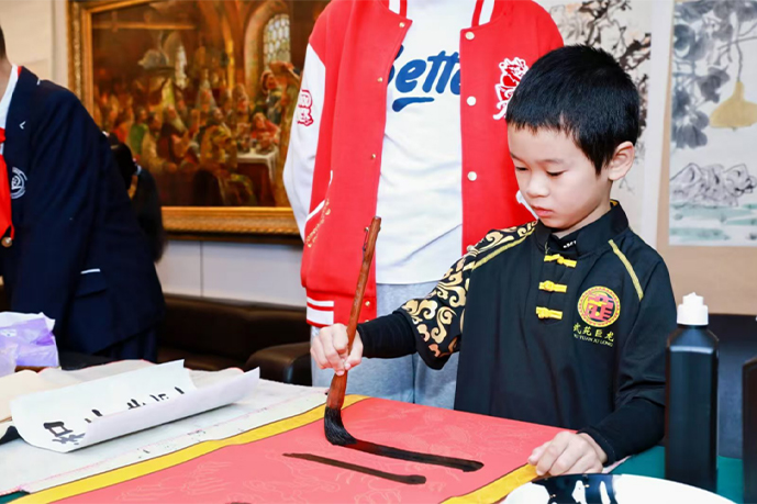 在活动的互动环节中,学生们进行了现场书法展示。孩子们一笔一画地书写汉字,专注的神情体现了他们对中国传统文化的热爱与传承。现场观众被这种浓厚的文化氛围所感染,纷纷赞叹于孩子们对书法艺术的认真态度。薛莹主任在活动中与学生们亲切交流,并对书法作品表示高度肯定。