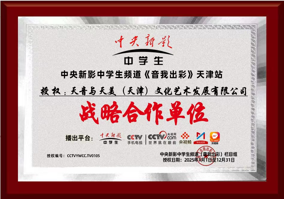 中学生频道《音我出彩》天津运营中心于2025年01月01日在北京市西城区国务院国有资产监督管理委员会商业机关服务局宣告成立,由产教融合工作委员会监督指导,天音与天美(天津)文化艺术有限公司承接, 中央新影中学生频道《音我出彩》栏目组直接授权。此举标志着该栏目在天津地区的发展迈出了重要的一步!