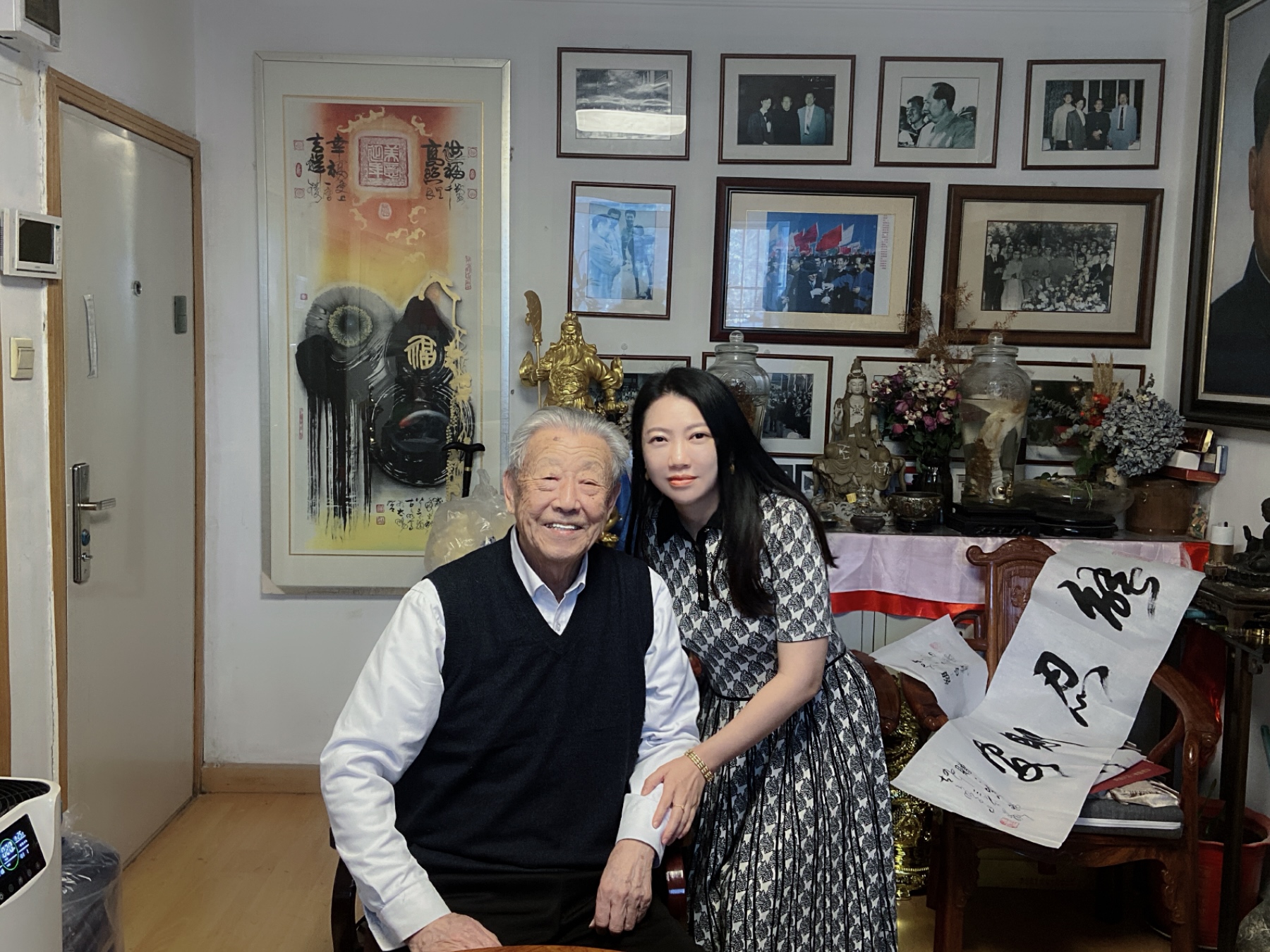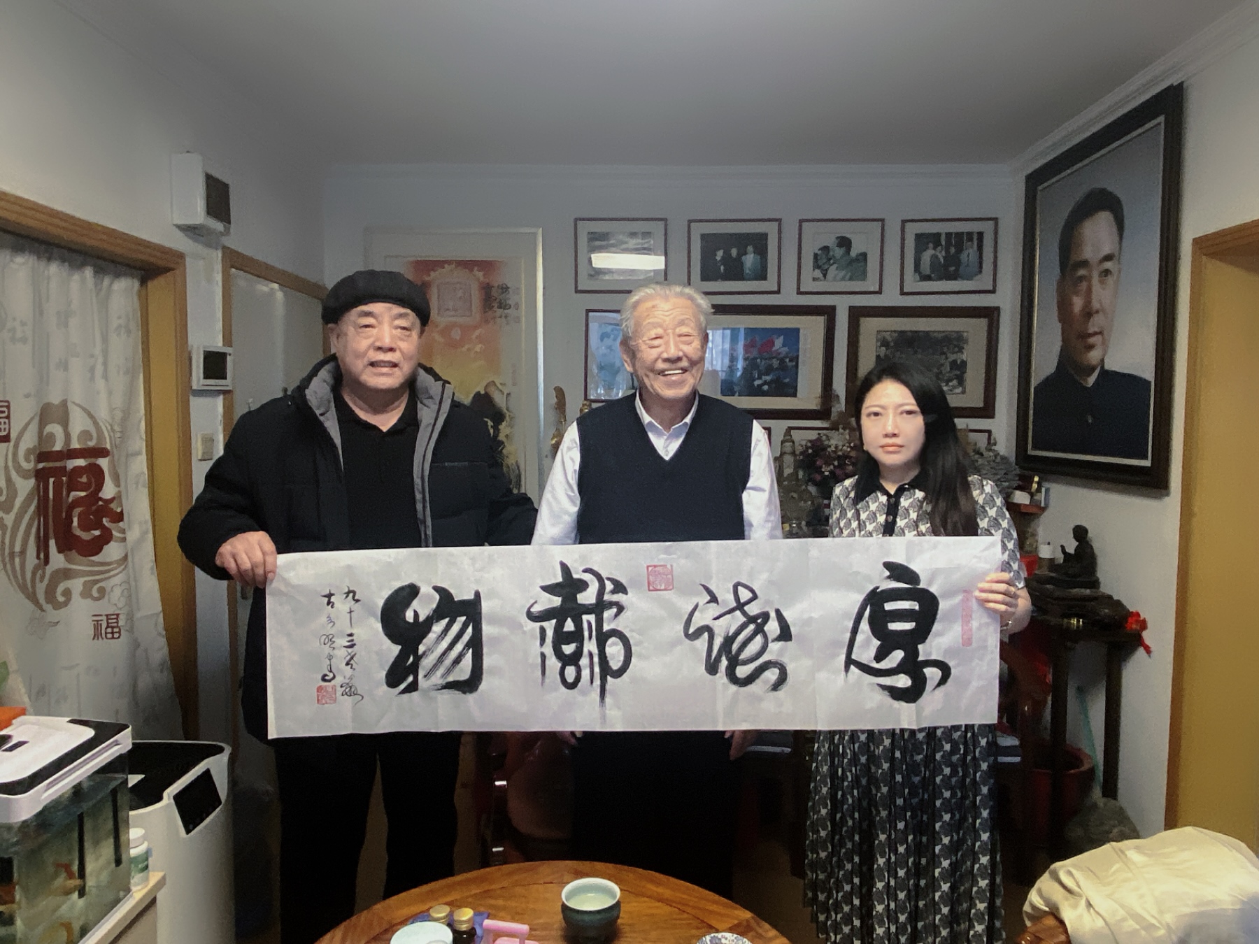 古老讲述了他年轻时在周总理身边工作的故事,并赠送了《厚德载物》的书法墨宝,古老的书法墨宝是高高悬挂在天安门城楼上的,沉甸甸的在手中感受到古老对晚辈的关怀与期许!